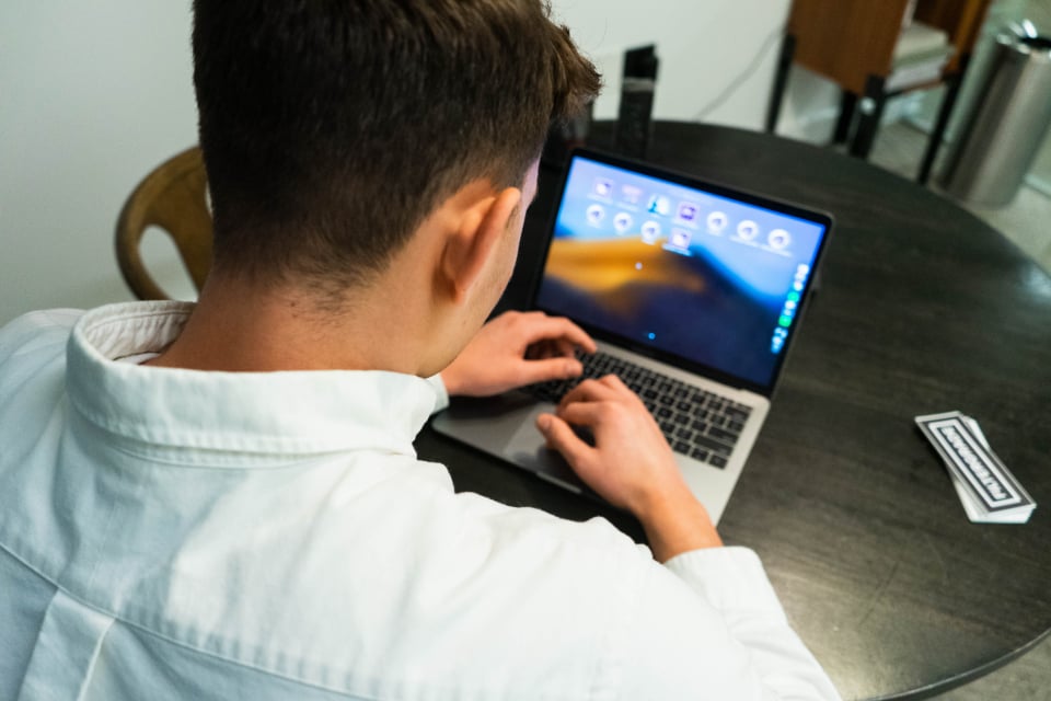 person using laptop on table
